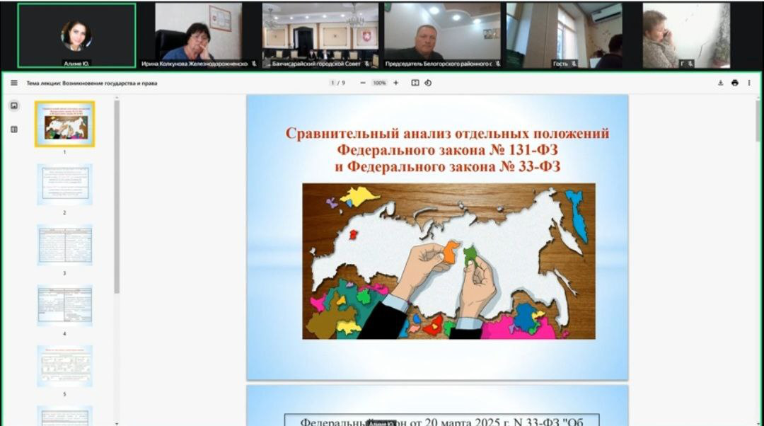 20 мая 2025 года в Центре развития компетенцией государственных и муниципальных служащих Республики Крым состоялся очередной вебинар на тему: «Сравнительный анализ отдельных положений Федерального закона № 131-ФЗ и Федерального закона № 33-ФЗ». Юнусова Алиме Наримановна, ведущий научный сотрудник Центра, доцент кафедры социально-гуманитарных дисциплин ГБОУВО РК КИПУ имени Февзи Якубова, рассмотрела актуальные вопросы, посвященные вопросам реформирования местного самоуправления в единой системе публичной власти Российской Федерации.